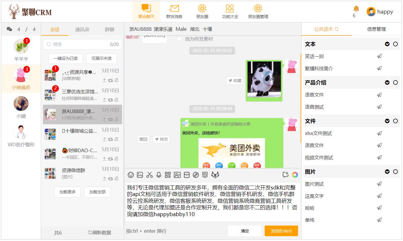 微信API接口,微信协议,企业级微信客服系统,微信聚合聊天系统,微信scrm系统源码;微信开发SDK,稳定商用四年的微信API接口,购买SDK授权会提供演示系统源码,方便做二次开发,换皮就能跑,咨询请加微信happybabby110;微信api接口可以用了做什么;对接企业CRM、SCRM;智能机器人;淘客机器人;云控系统;营销系统、营销工具;智能客服系统;群管理系统;营销手机,手机监控,工作手机;